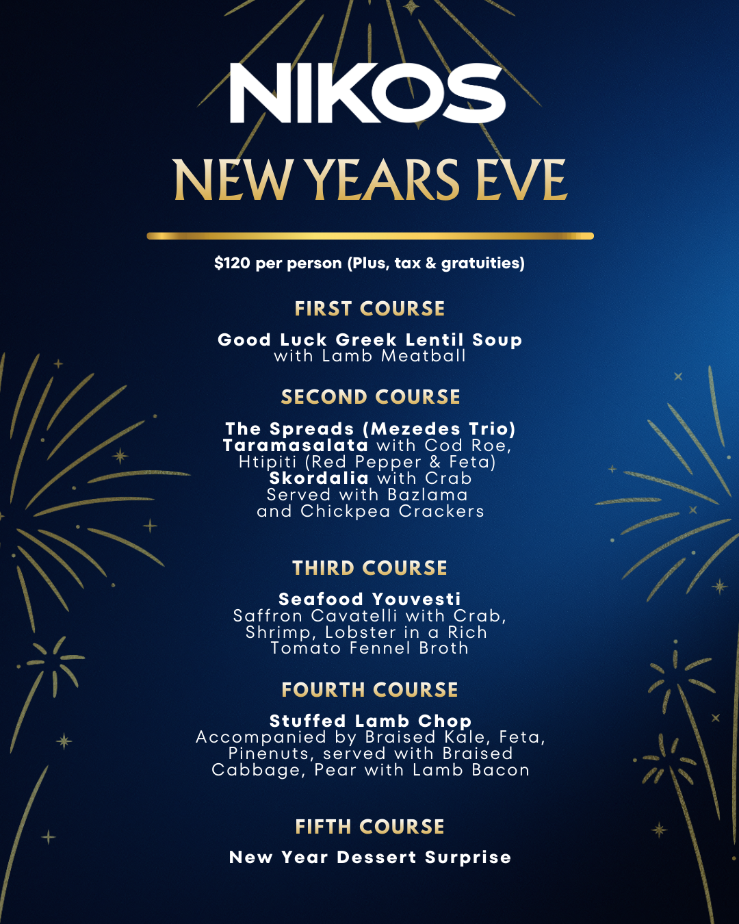 Ring in the New Year with an elegant dinner at Nikos. Join us for a thoughtfully curated five-course prix fixe menu that highlights the flavors we’re known for—refined, seasonal, and made to celebrate.